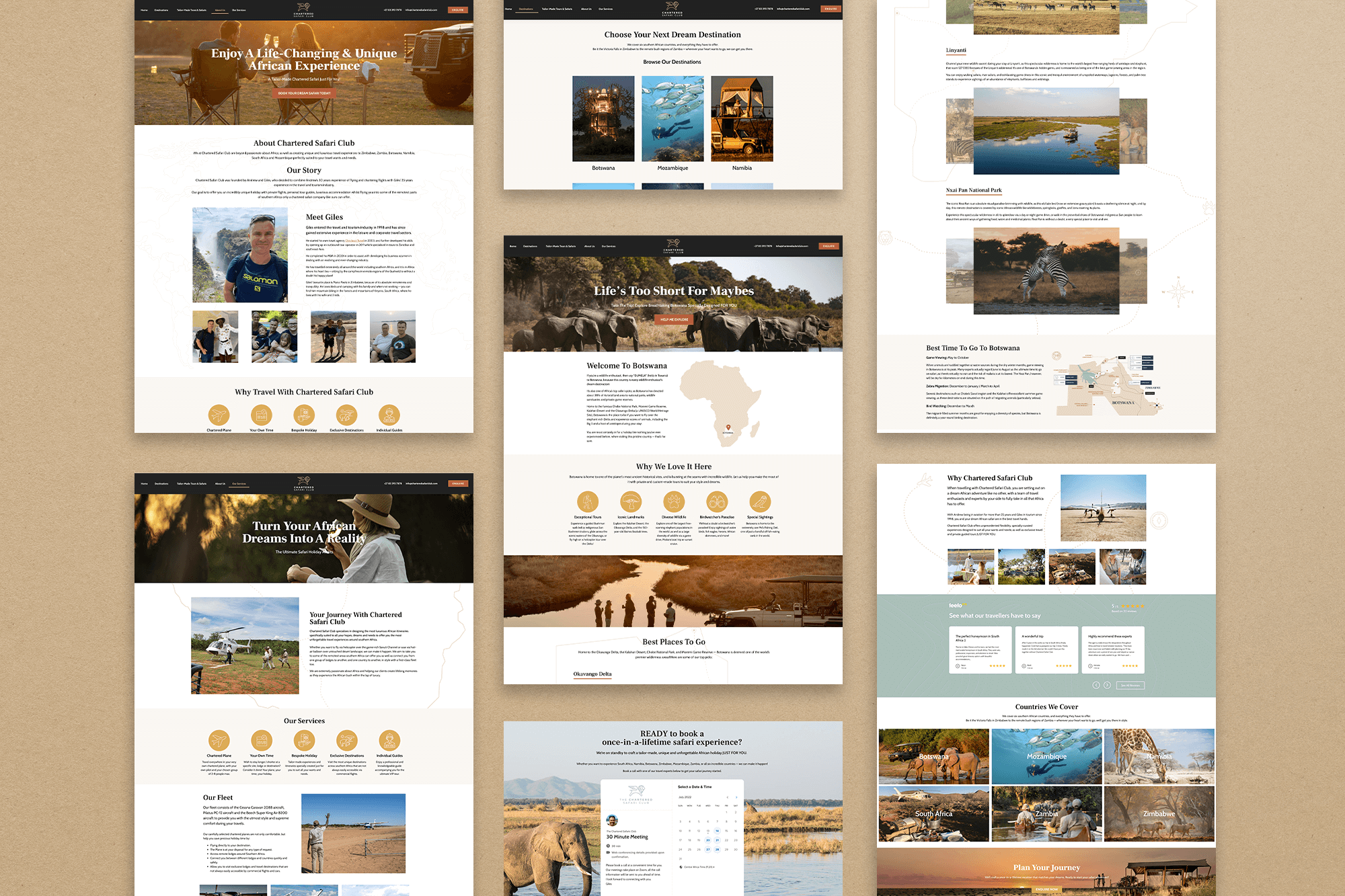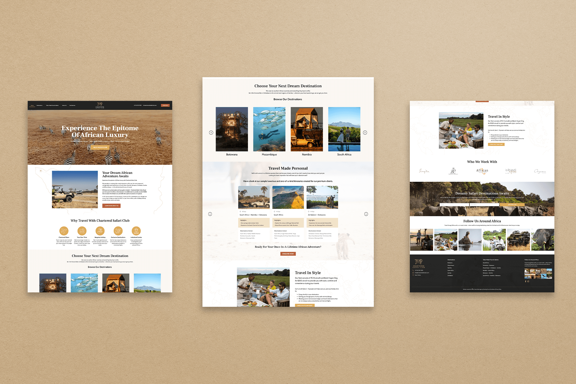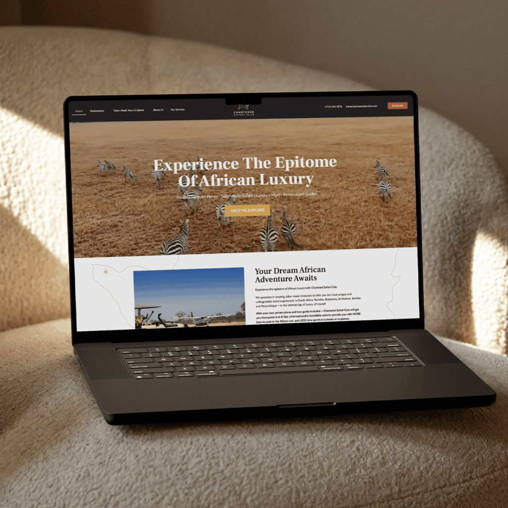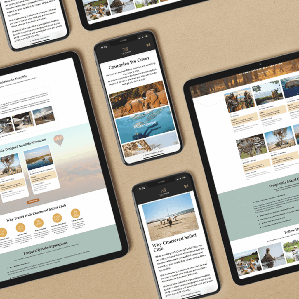 Chartered Safari Club wanted an online presence that captured the adventure and exclusivity of their private African safaris. Using their existing logo as the foundation, we created a full brand palette and extended their visuals to feel consistent across all platforms.
