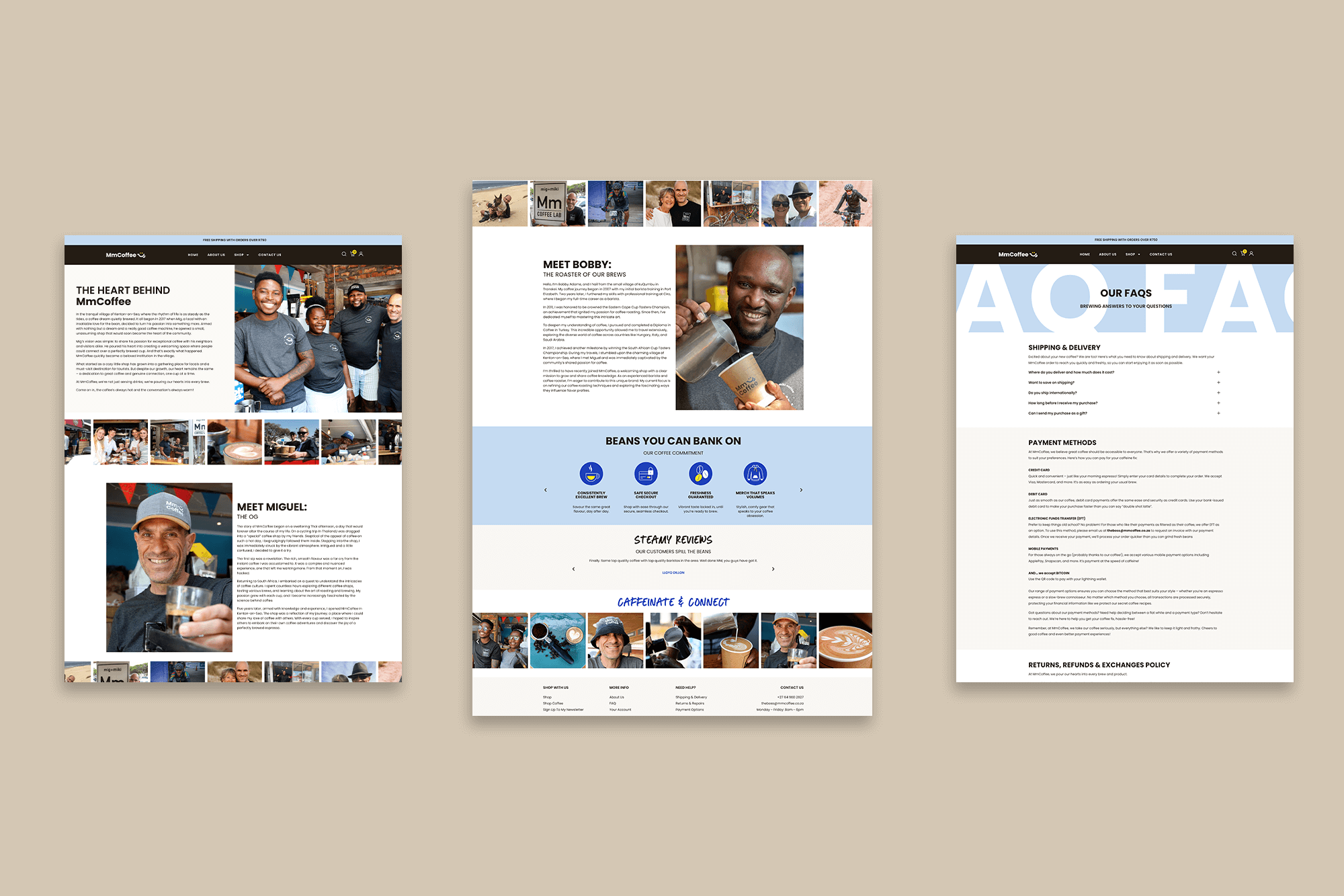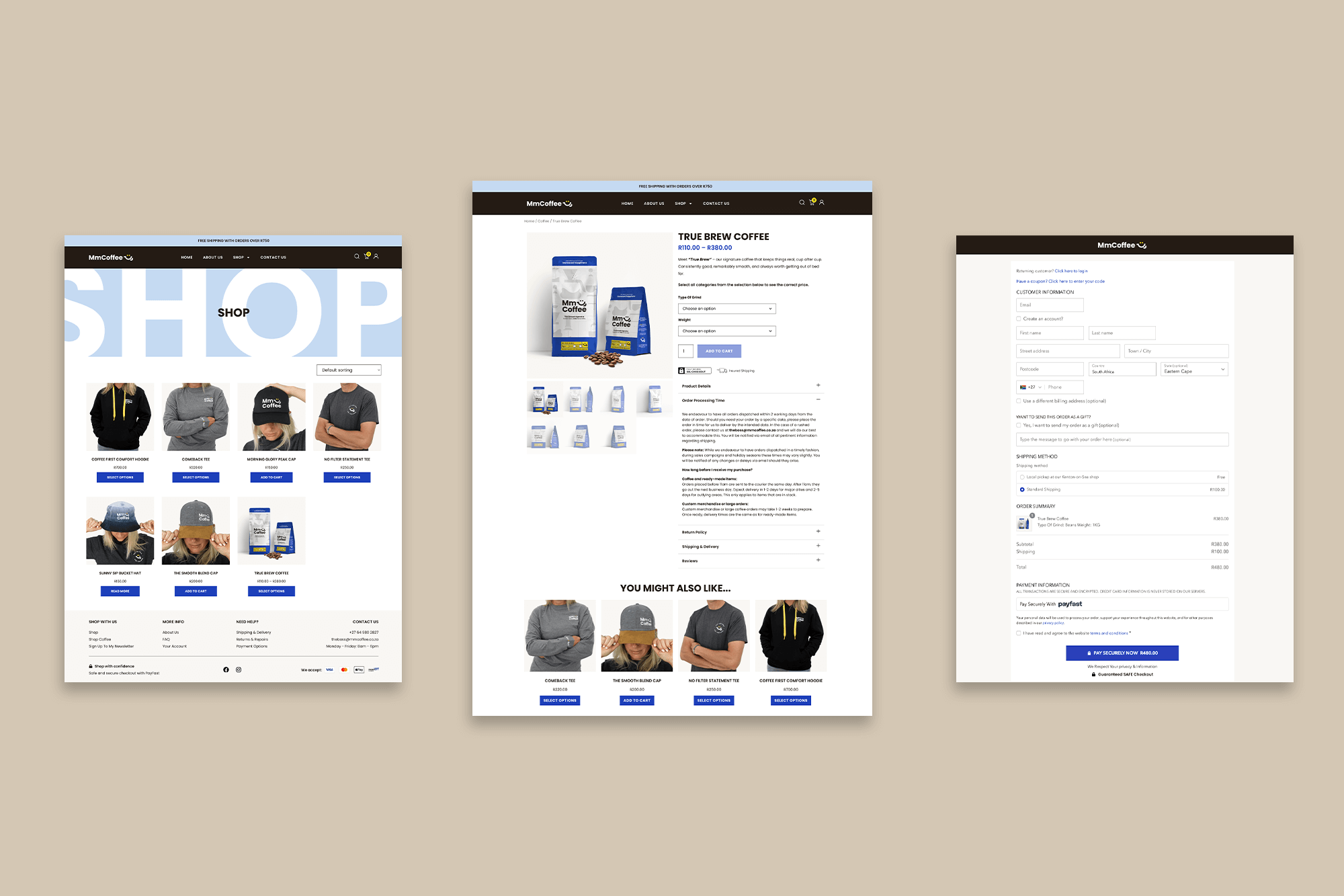 We extended the brand identity into packaging and merchandise design to give MmCoffee a bold and memorable presence offline as well as online.